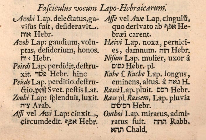 Hebrew – in which Rudbeck was educated through Johannes Kemper – as well as Sámi formed central points of reference in these speculations. There was a kinship he believed to be manifesting before his eyes, between the people he encountered in the north and the Bible. In a linguistic work that Rudbeck announced as his Lapo Hebraeus (‘Hebraic Sámi’), he wanted to explore this kinship further.3