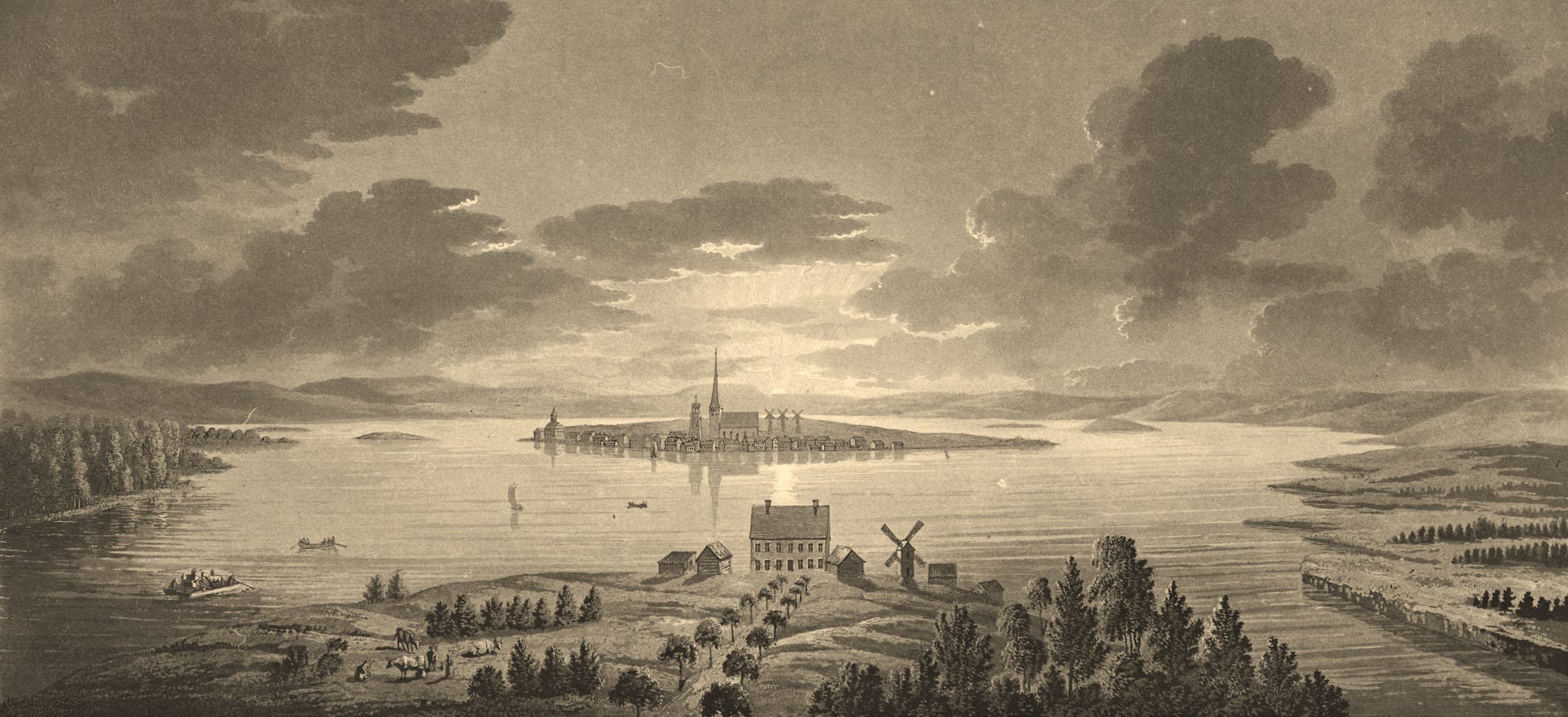 A warm light already poured over the wooden shingles when the party climbed the bell tower. At the end of the 17th century, most of the island of Torneå still was level ground, its northern tip splitting the river into two arms. Beyond its northern horizon, they expected the sun soon to near the forests and soft hills – scraping its line, yet its centre never sinking beneath.