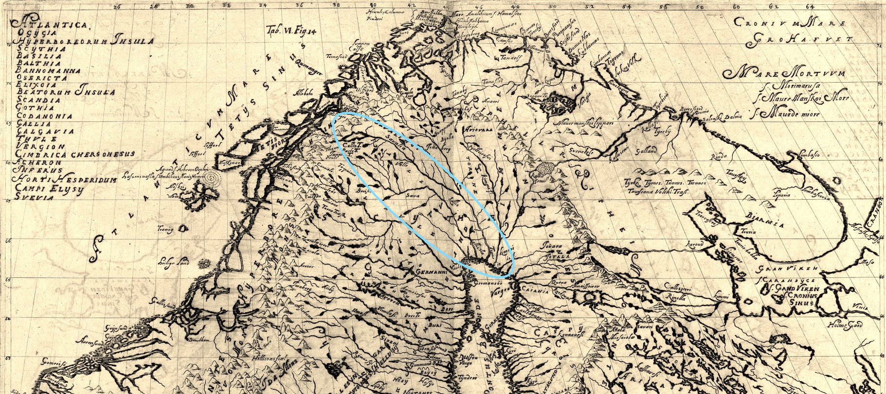 It must have been around the 1680s when Olof Rudbeck began to zero in on the Torne Valley. The map he printed with the first volume of the Atlantica (1679) had still placed the river in a valley without names and contours, its side arms branching randomly as if copied from the map in Johannes Scheffer’s Lapponia from 1673.