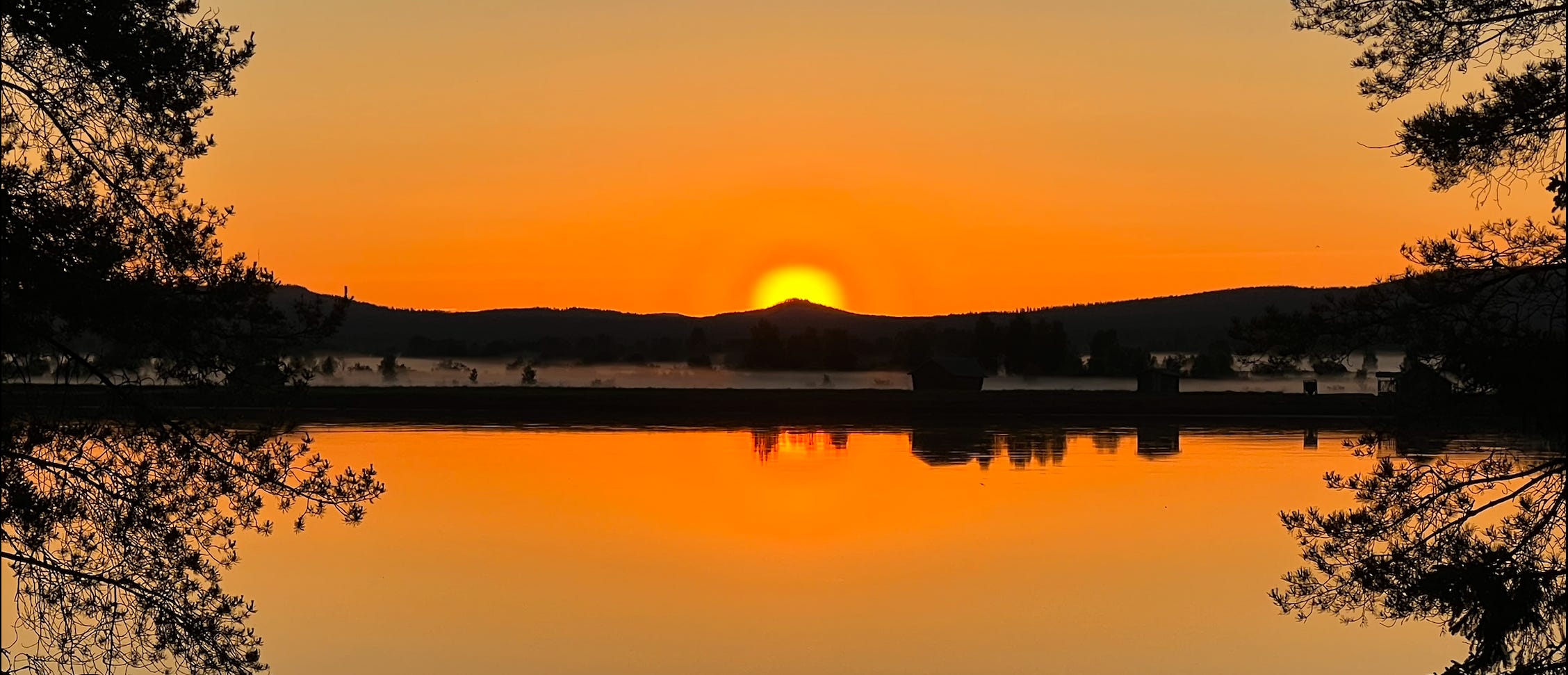 Soon Mount Aavasaksa edged its silhouette into the sun’s course. The ridge cast a shadow over the eastern bank, and where the shore still lay dimmed, mist hung low – the water beyond already aglow in apricot light.