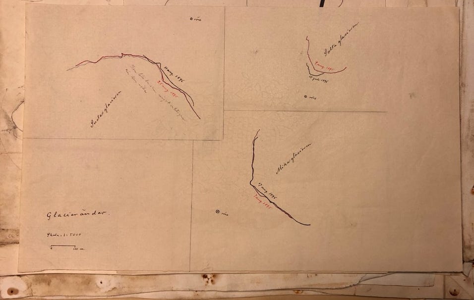 The sketches resulting from their observations show the rims of glacier tongues as they changed across the year. What the eye alone can’t hold they made visible – the glacial dimension of time.