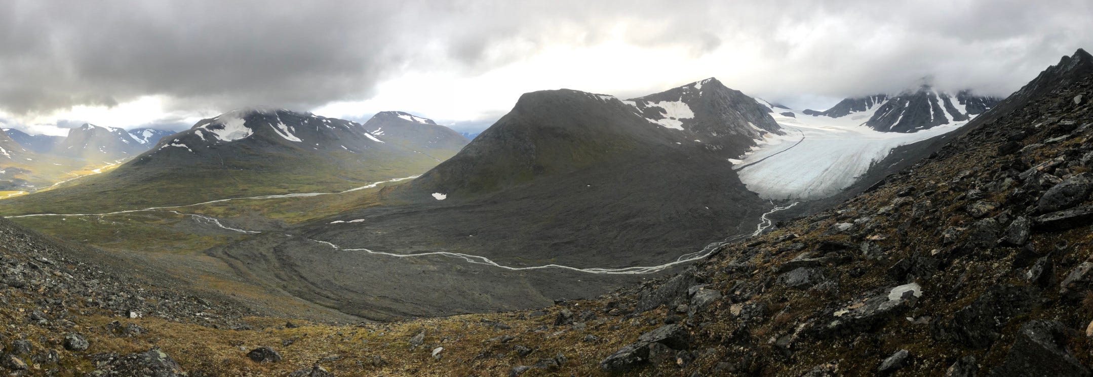 The peak of Sarektjåhkkå pierced Mikka Glacier, as if riveting the sheet of ice. From its brim, meltwater wound down the valley, as if unravelling the stub of ice. Further down, the coal-coloured face of Jållok swelled, driving a wedge into branching valleys.