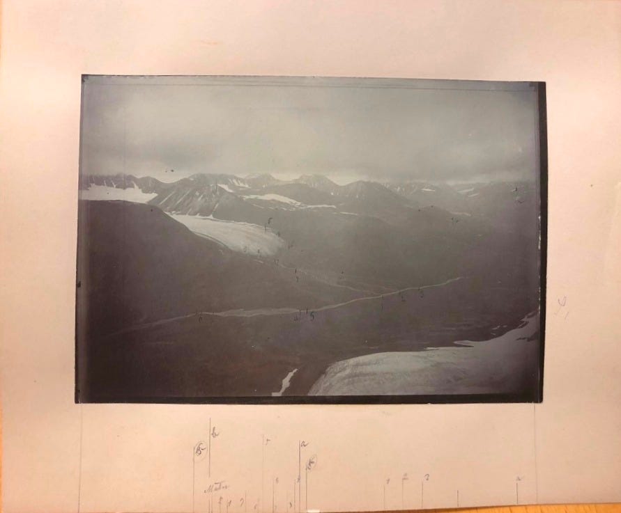In August 1907, a man removed it from the protective envelope, fixating it with metal clamps in the housing of a wooden camera. Stabilising the tripod on rocky ground, he centred its angle on a mountain across a glacier valley.