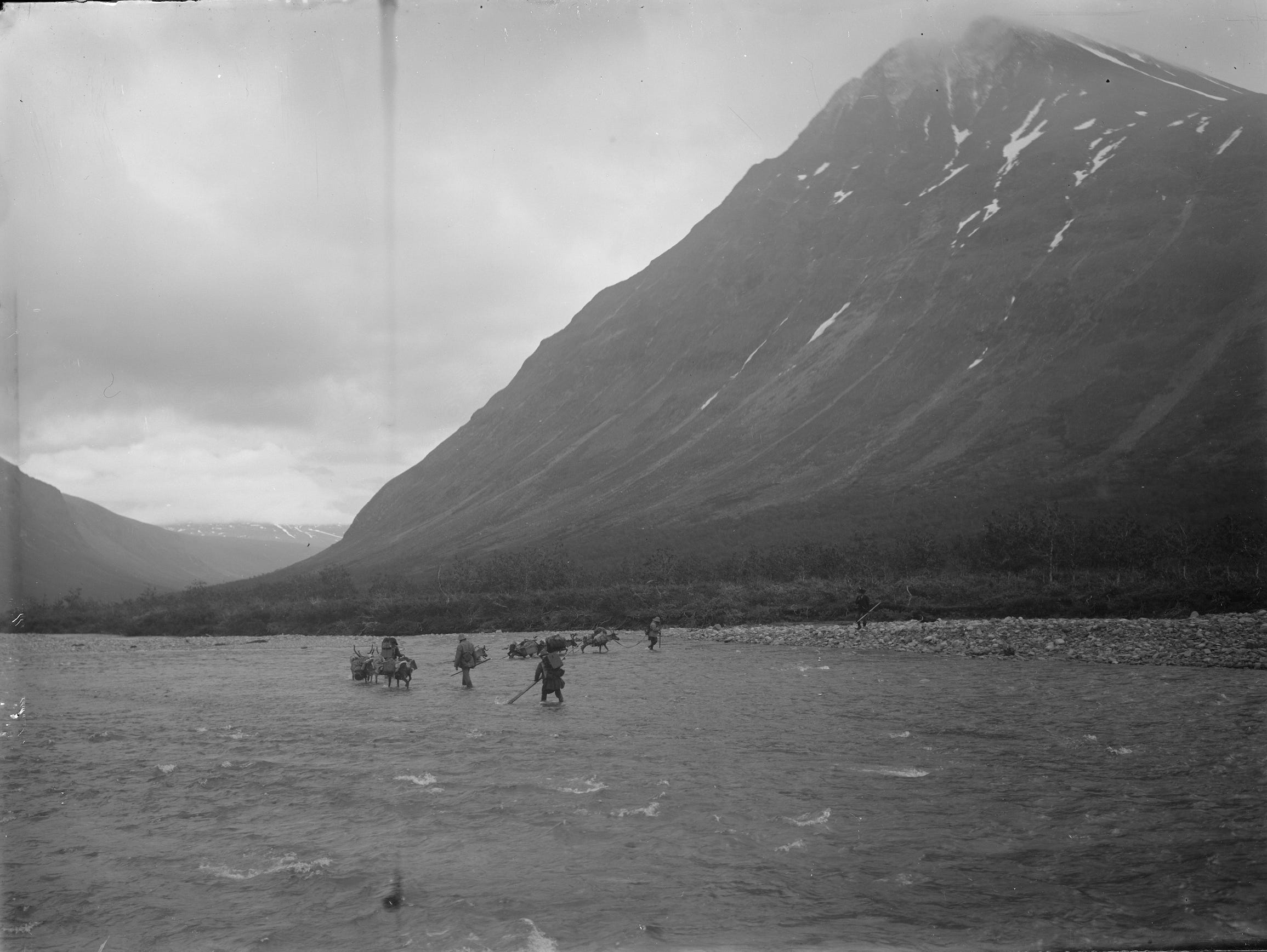 In 1922, Hamberg would reuse panoramic views his negatives created of Sarek to illustrate a guide for the Swedish Tourism Association.13 Before he set out on his first journey and long before the hikers followed, Sámi herders have driven reindeer through its valleys.
