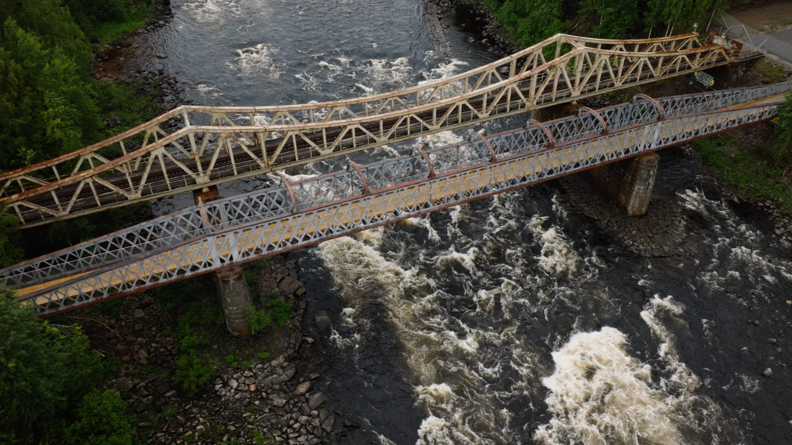 In Frozen Atlantis, the river chapter ends at Edänge, the southernmost of the rapids on Ljusnan left undammed. Two abandoned railway bridges here arch above the river, across a whitewater threshold.